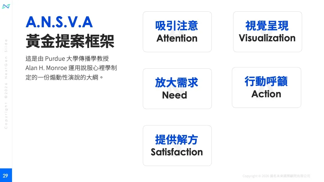 ANSVA 正是這樣一套專門為說服而設計的敘事結構,源自 Purdue 大學傳播學教授 Alan Monroe 所提出。(參考文章:The Grand Valley State University Speech Lab)
